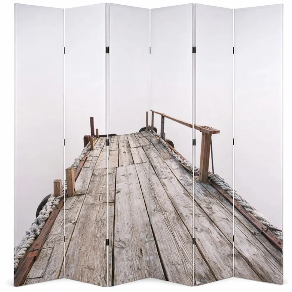 Dieser 6-teilige Raumteiler mit den Maßen 228 cm x 170 cm dient dazu, Privatsphäre zu schaffen oder Raumabschnitte zu separieren. Er besteht aus einem stabilen Holzrahmen und robustem Leinwand-Vlies, das beidseitig bedruckt ist. Das Motiv zeigt einen See mit einem Steg und fügt eine natürliche Note hinzu. Bei Nichtgebrauch kann der Raumteiler platzsparend zusammengeklappt werden.