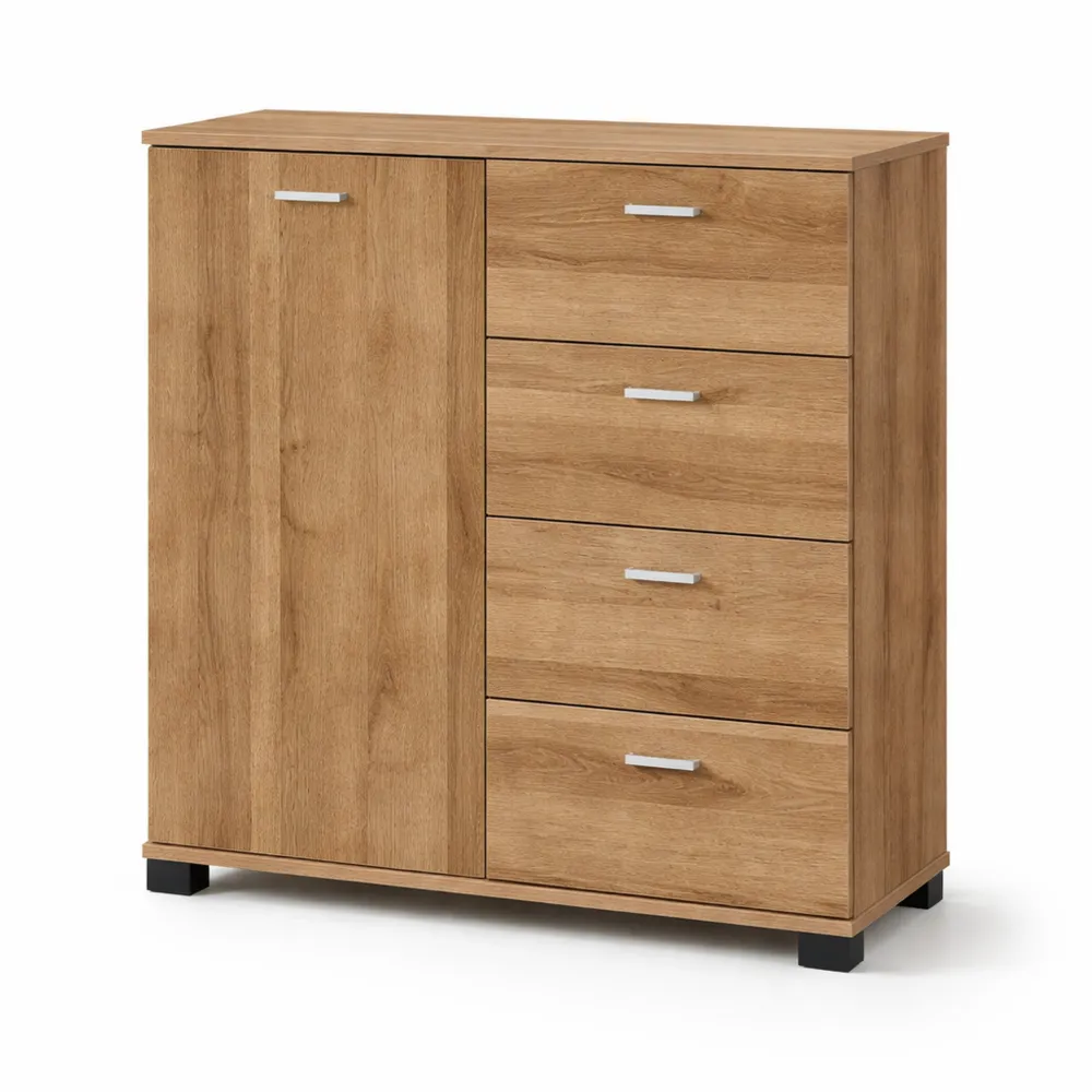 Sideboard mit Schranktür und vier Schubladen, ideal zur Aufbewahrung von Haushaltsgegenständen. Das durchdachte Design eignet sich für verschiedene Hausbereiche.