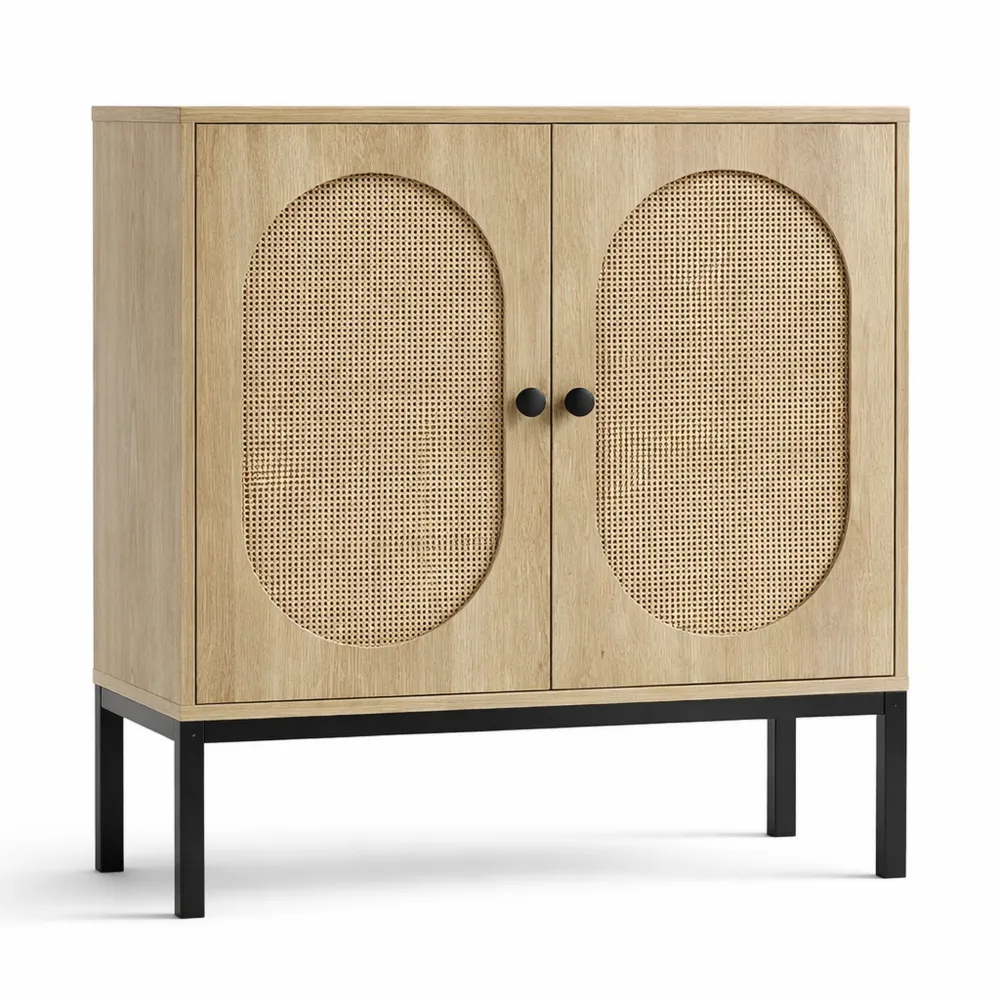 Das Sideboard bietet Türen aus Rattan und eine stabile Metallbasis mit quadratischen Füßen. Es besteht aus MDF und PB-Holzwerkstoffen mit verstärkten Ecken und robusten Metallbeinen, die eine hohe Tragfähigkeit gewährleisten. Mit zwei geräumigen Fächern hinter den Türen und einer offenen Ablagefläche oben bietet es flexiblen Stauraum für Geschirr, Bücher oder Deko. Geeignet für Ess- oder Wohnzimmer, Flur oder Küche. Der Aufbau ist dank bebilderter Anleitung schnell erledigt.