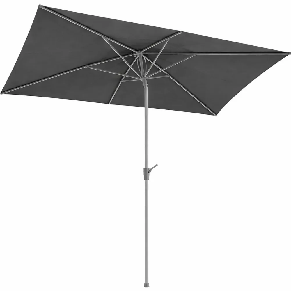 Bespannung aus Polyester, ca. 180 g/m², wasserabweisend imprägniert und abnehmbar für Handwäsche. UV-Schutz 50+ nach australisch-neuseeländischer Norm. Stahl-Gestell silbergrau pulverbeschichtet, zweiteiliger Stock ca. 38 mm. Automatik-Knicker und Kurbelöffnung. Der Schirm kann für eine platzsparende Einlagerung auseinandergebaut werden.