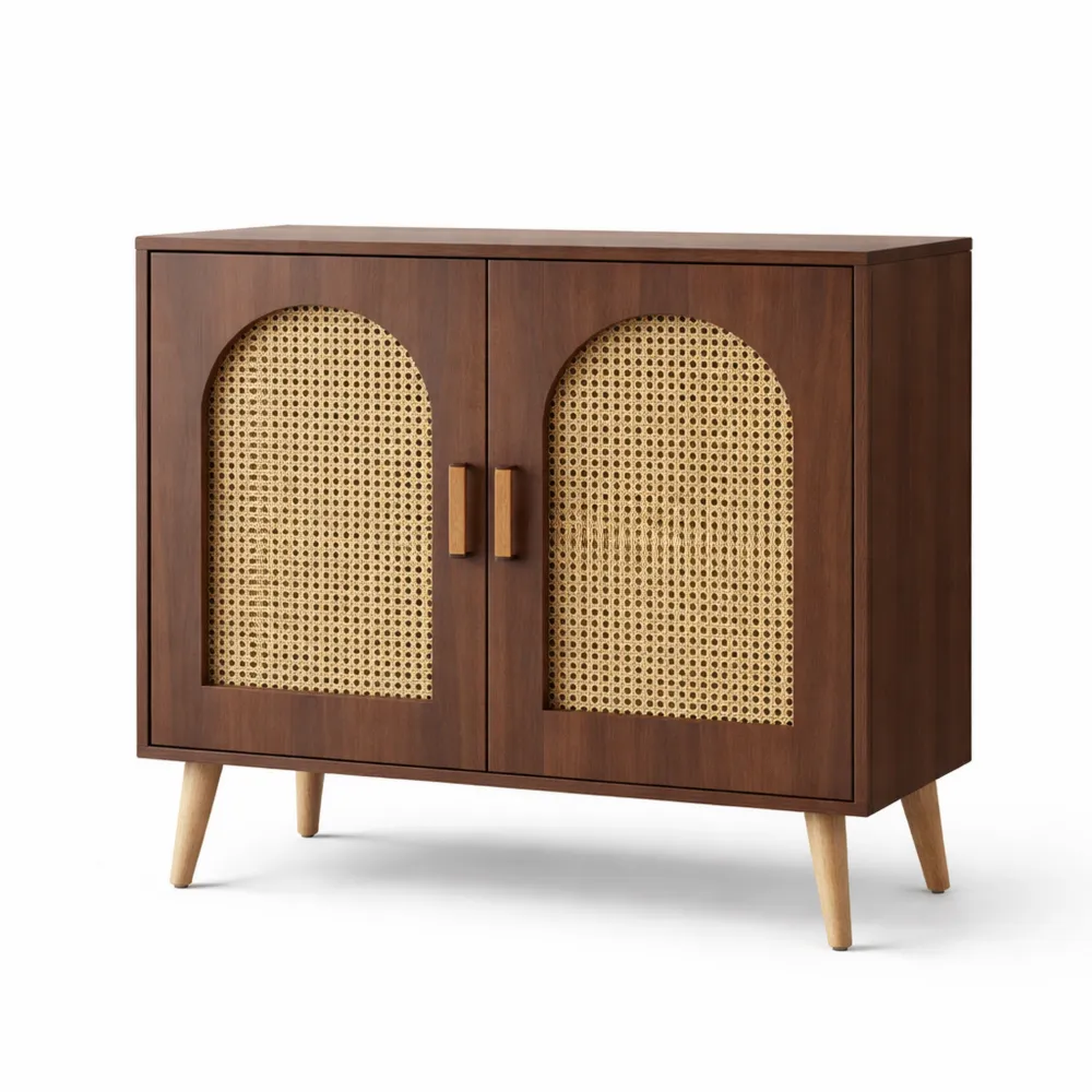 Pflegeleichte Melamin-Oberfläche bietet Stauraum mit zwei Ablagefächern. Türoberflächen mit Poly-Rattan sorgen für modernen Look. Holzgriffe ergänzen das Design. Die Kommode ist für verschiedene Wohnbereiche geeignet und sorgt für Ordnung. Mit robusten Füßen und Bodenschonern ist Stabilität gegeben.