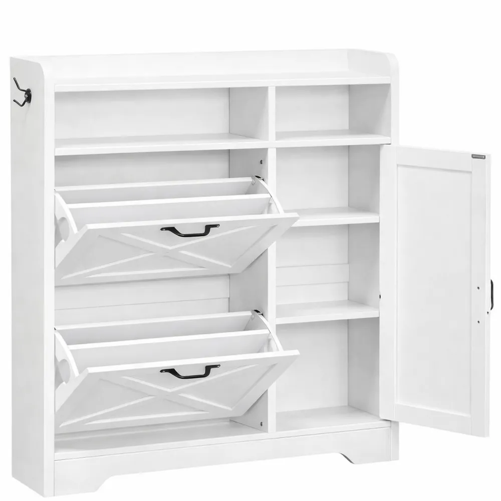 Der Schuhschrank bietet Stauraum für verschiedene Schuharten und verfügt über einen zusätzlichen Seitenschrank für hohe Schuhe. Die verstellbaren Ablagen ermöglichen Flexibilität bei der Lagerung unterschiedlicher Größen von Schuhen. Sein kompaktes Design eignet sich gut für kleinere Wohnräume und Eingangsbereiche. Hergestellt aus Spanplatten und Metallbeschlägen, bietet er eine stabile Nutzung. Bei der Montage helfen nummerierte Teile und eine ausführliche Anleitung. Sein schlichtes Design ermöglicht eine unkomplizierte Integration in verschiedene Wohnstile.