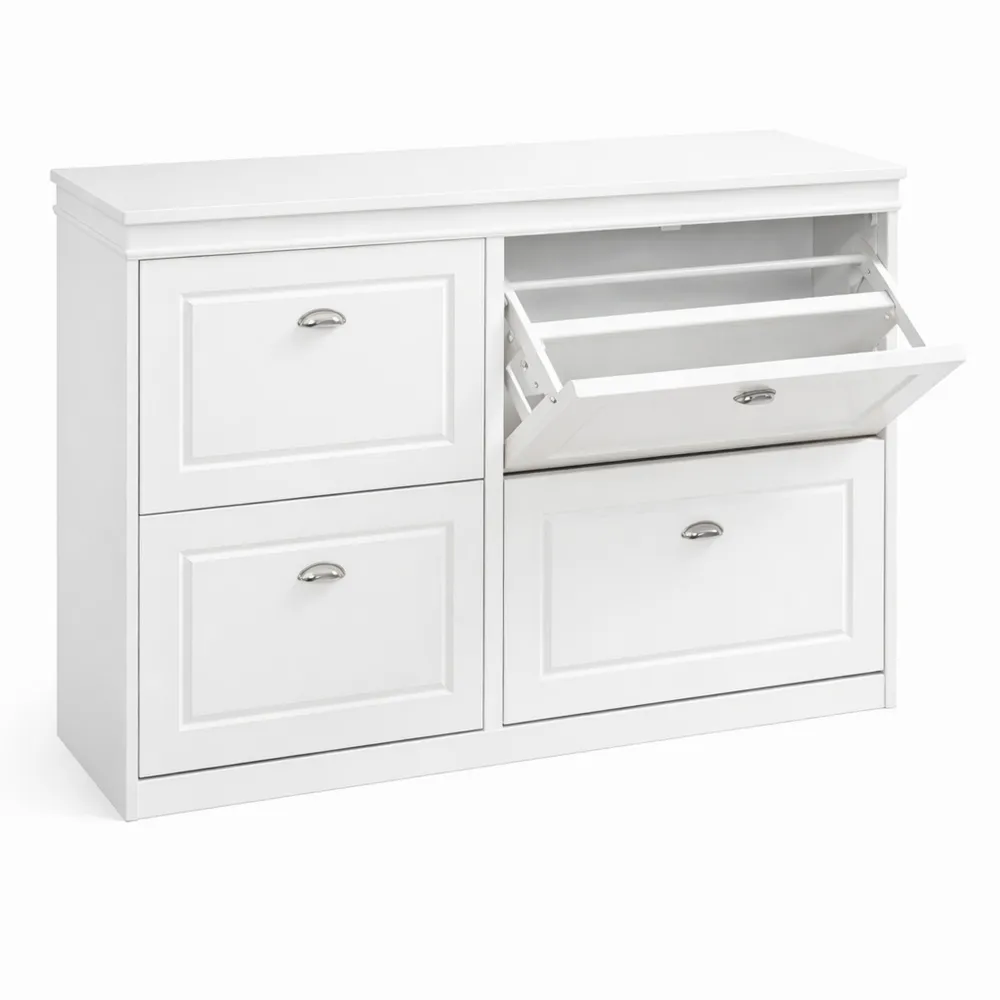 Dieser Schuhschrank bietet durch seine kompakten Maße praktische Aufbewahrung im Flur oder Schlafzimmer. Die Gesamtmaße sind 105 cm Breite, 82 cm Höhe und 24 cm Tiefe, mit einer maximalen Belastbarkeit von 100 kg. Der Schrank besteht aus MDF und ist weiß lackiert. Mit 16 Fächern bietet er Platz für viele Schuhe verschiedener Größen. Die Konstruktion ist stabil und enthält einen Kippschutz zur sicheren Befestigung an der Wand. Er ist modular erweiterbar und perfekt anpassbar an individuelle Bedürfnisse.