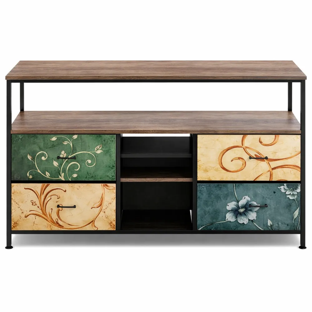 Der TV-Schrank im Retro-Stil integriert sich nahtlos in verschiedene Wohnkonzepte und bietet praktischen Stauraum. Die Kombination aus Metallrahmen und Spanplatte sorgt für Stabilität. Ausgestattet mit mehreren Schubladen und Ablagen bietet der Schrank Platz für verschiedene Haushaltsgegenstände. Maße: 137 x 29,8 x 78 cm. Die verstellbaren Füße ermöglichen eine stabile Platzierung auf unebenen Böden. Der eingebaute RGB-LED-Streifen bietet eine Vielzahl von Lichtfarben und -modi.